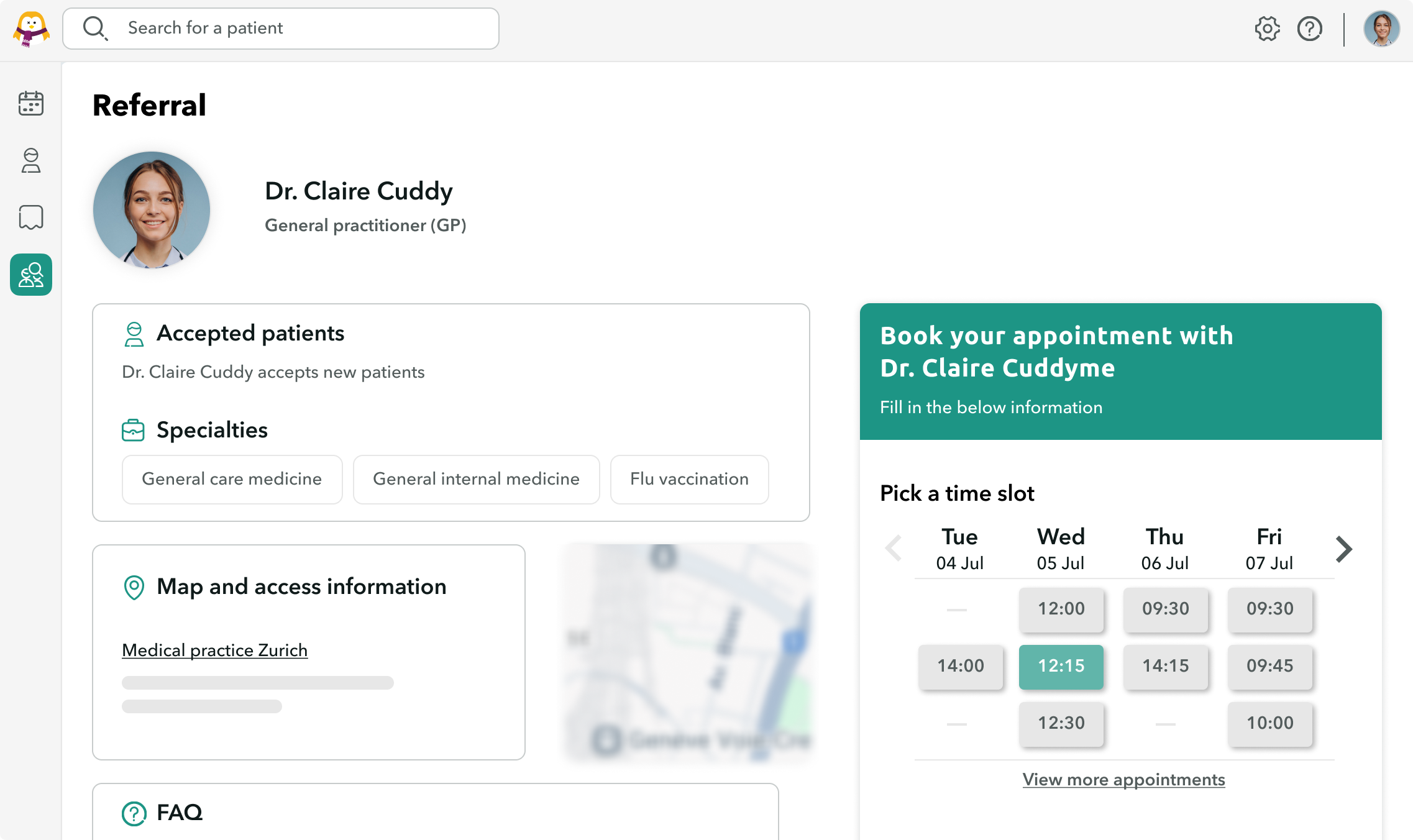 Yes. The referral module allows your colleagues to book an appointment directly for their patients, based on your availability and the selected reason. All relevant information is transmitted automatically and fully securely, as OneDoc is ISO 27001 and DCPO certified, and also compliant with the nFADP and GDPR.