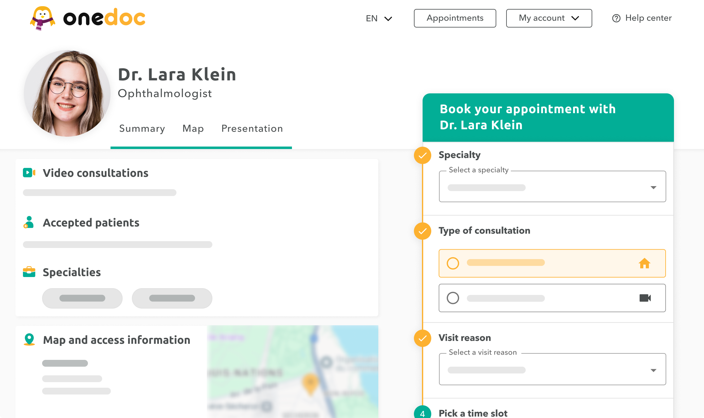 When patients search for an ophthalmologist, they do so on Google, Google Maps, OneDoc.ch or even AI tools such as ChatGPT. By using OneDoc, this is where you appear. Your profile on the platform highlights what matters (your speciality, your expertise, your location, your consultation reasons and availability, and more) so that wherever the patient searches, you appear in a relevant way. This means you will regularly attract new patients while offering them a modern experience from the moment they search, right through to the booking stage.
